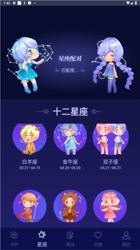 2、【星座】页面:此页面包含十二星座的内容,用户可在此查看自身近期的运势状况。