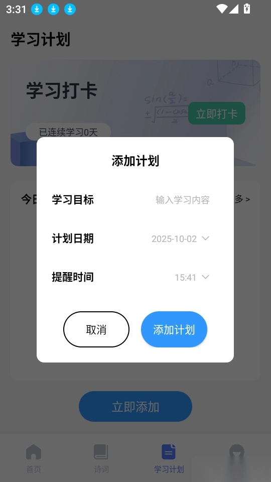 4、输入学习内容与计划日期,设置好提醒时间后,点击“添加计划”按钮即可完成保存。