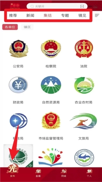 1.首页顶部设有“推荐”“新闻”“专题”等内容频道的切换入口,向下滑动页面还能按照部门或区域分类浏览相关信息。