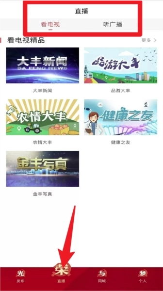 2.点击底部的“直播”入口,就能选择观看大丰新闻、农情大丰等电视节目,还支持回放和切换栏目。