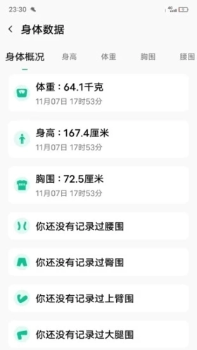 身体围度记录,用于记录身体的多种围度信息,包括身高、体重、胸围、腰围等数据。