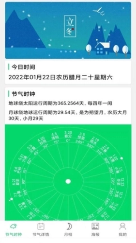 作为一名传统文化爱好者,我对“传统节气”这款应用十分满意。它不仅免费供用户使用,还提供了详尽的农历月相信息,帮助用户深入了解每个节气的特征与规律。我尤其欣赏这款应用的精致设计——无论是太阳时钟还是节气主题海报,都生动呈现了传统节气的独特韵味。借助这款应用,我既能学习到丰富的节气知识,又能随时随地便捷地掌握节气的相关规律与信息。