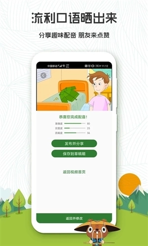 2、通过模仿配音、生词翻译、作品分享等功能,让你能随时随地玩配音,在趣味体验中学习并提升英语口语能力;