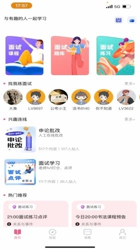 活书考公借助实时面聊面试练习与双人竞技模式,营造出浓厚的学习氛围,助力用户沉浸其中、专注学习。用户可加入趣味公社学习圈子,在幸福陪伴中,参与群聊趴语音房活动,达成高效的学习交流。