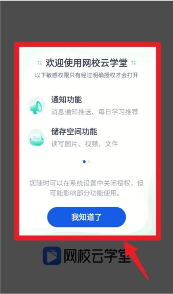 1、首次进入网校云学堂时,系统会弹出权限说明提示,其中涵盖通知推送与存储空间权限相关内容,目的是保障学习信息能够及时送达,同时确保资料可以正常进行读取和写入操作。