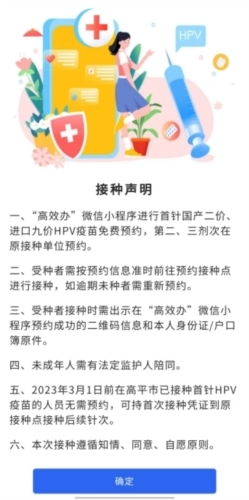 3、页面会弹出HPV疫苗接种声明,大家务必仔细阅读,其中包含接种疫苗的详细注意事项,阅读完毕后点击“确定”按钮即可。