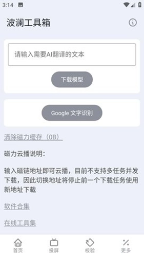 波澜工具箱最新版是一款实用性极强的手机工具箱软件,能为你提供在线播放、远程投屏、AI文本翻译、文字识别等多种功能,支持的功能十分丰富且非常实用。上百款工具覆盖了各个领域,所有工具均免费使用且无任何广告,可帮助你应对不同场景。此外,它还具备磁力功能,输入磁力地址即可获取对应的文件,快来体验吧!