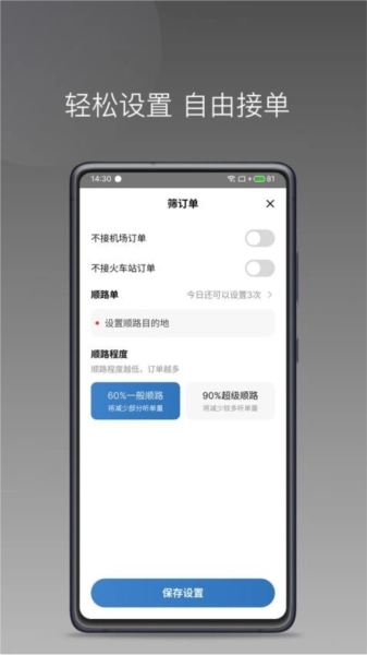 5、自由接单:支持司机根据自身需求自主设置订单,并保存相应的接单路线,以提升接单效率。