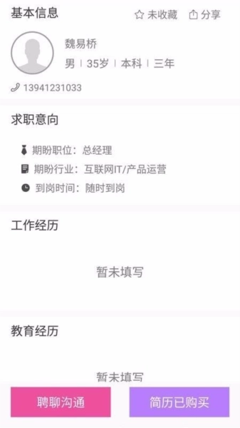 3、点击选中的简历进入详情页后,即可使用分享、收藏、发起沟通以及购买等功能。