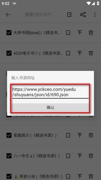 接着复制上面其中一个书源,点击“确认”;