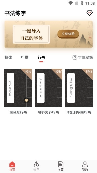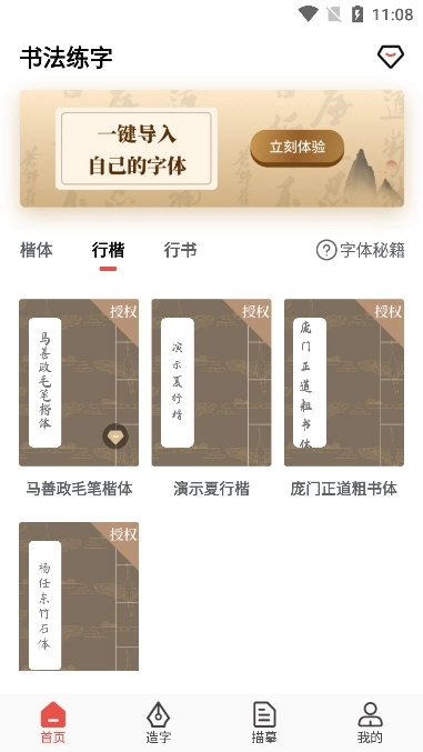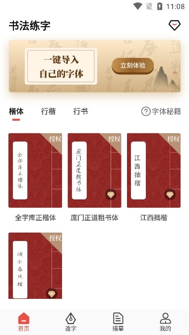 2、点击首页的“字帖库”,可以按照字体类型、学习场景或者难度等级来筛选字帖,点击想要练习的字帖就能进入练习界面。
