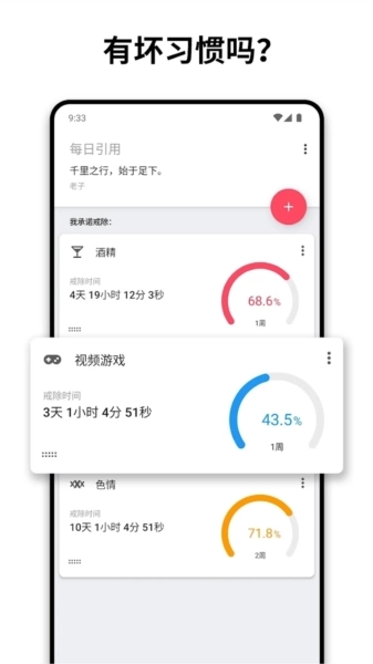 Quitzilla是一款助力你戒除坏习惯的手机应用,克服成瘾并非易事,你可以针对自身的坏习惯或成瘾问题,借助这款应用进行分析并彻底战胜它们。它能加速你的自我提升与个人成长,帮助你摆脱成瘾困扰和不良习惯。该软件通过数据呈现的方式激励戒瘾,仅适用于有戒瘾意愿的人群。当然,戒瘾最终还是要依靠自身的毅力,软件仅起到辅助作用。