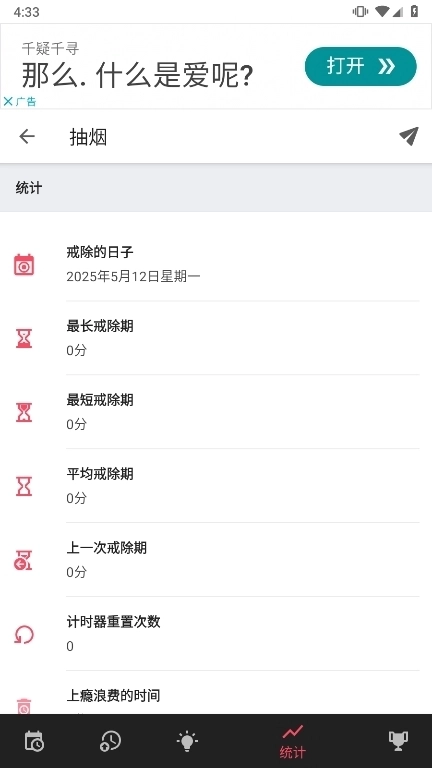 点击具体习惯,即可查看详细信息,其中包含戒断时间、节省的金钱、最长戒断周期等统计数据。
