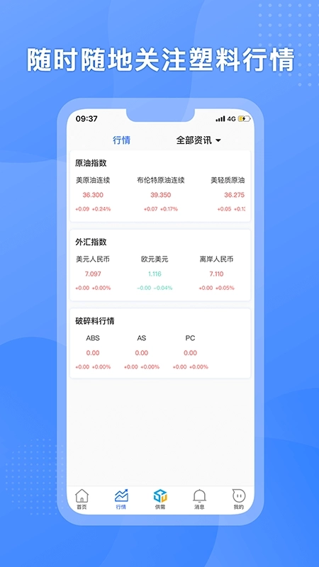 6、设置行情板块,方便用户查看各类指数信息与不同塑料的实时行情,及时了解涨跌动态;