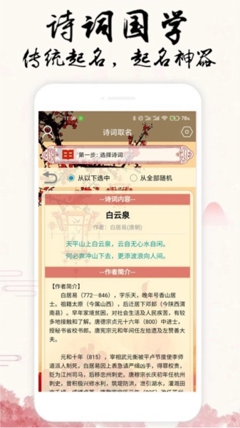 诗词取名功能:依据选定的诗词及填写的信息,筛选并生成姓名。