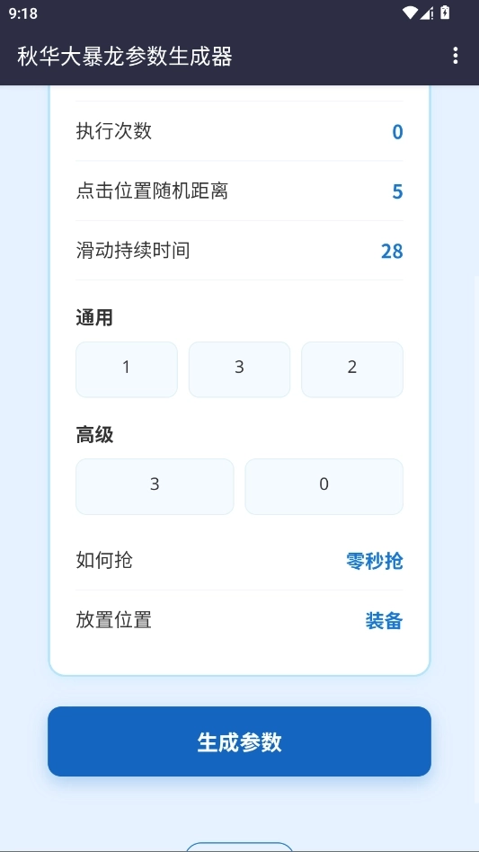 -快速生成参数:打开秋华大暴龙参数生成器App后,先选择对应的场景模板,可选项为游戏、抢购和挂机;接着通过悬浮窗功能点选目标位置,再对点击间隔与次数进行设置,最后一键生成参数即可,全程无需手动输入坐标。