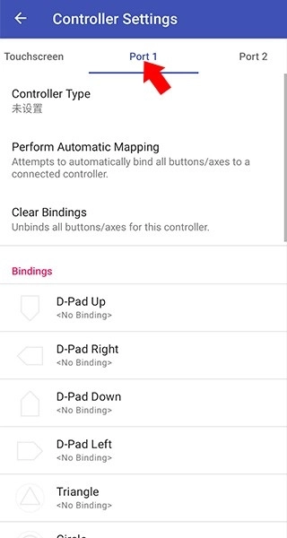 3、接下来在Controller Settings上方的导航栏里选择Port 1选项,然后在弹出的界面中对游戏手柄的按键映射进行设置。