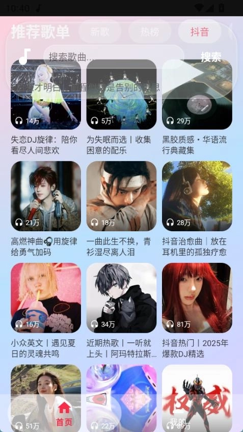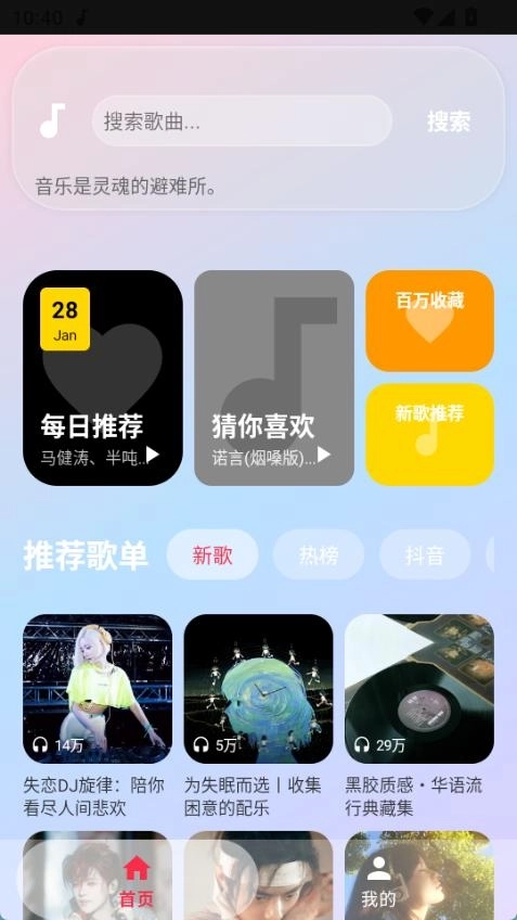 1、 点击首页的搜索框,输入关键词即可播放歌曲,也可以直接在首页的榜单、分类歌单中挑选歌曲进行播放。