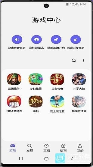 1、在本站完成三星游戏中心的安装后启动软件,在首页的游戏板块,你可以进行游戏声音开关、高性能模式、游戏加速等设置操作,同时也能搜索自己想玩的游戏;
