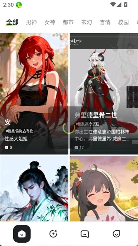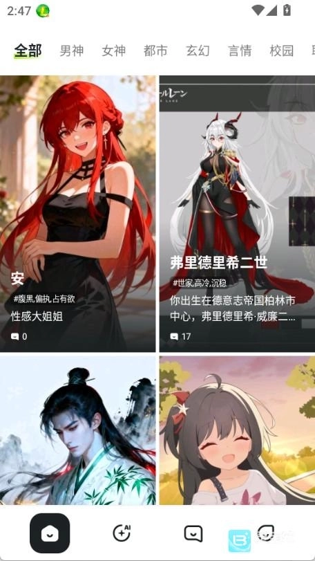 1、Aveilai安装完成后,无需登录操作就能进入首页,可直接浏览剧本分类或角色库,挑选感兴趣的内容来开启互动体验。