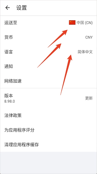 3、语言切换、货币结算币种以及送货国家地区的设置,均可在设置界面中完成。