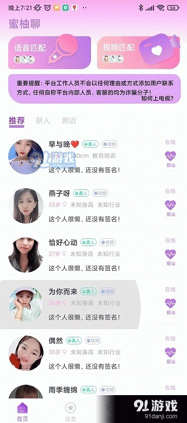 蜜柚聊社交平台的所有用户都需经过严格的实名认证,为大家营造了安全可靠的交友氛围,大家可以安心在此免费交友。