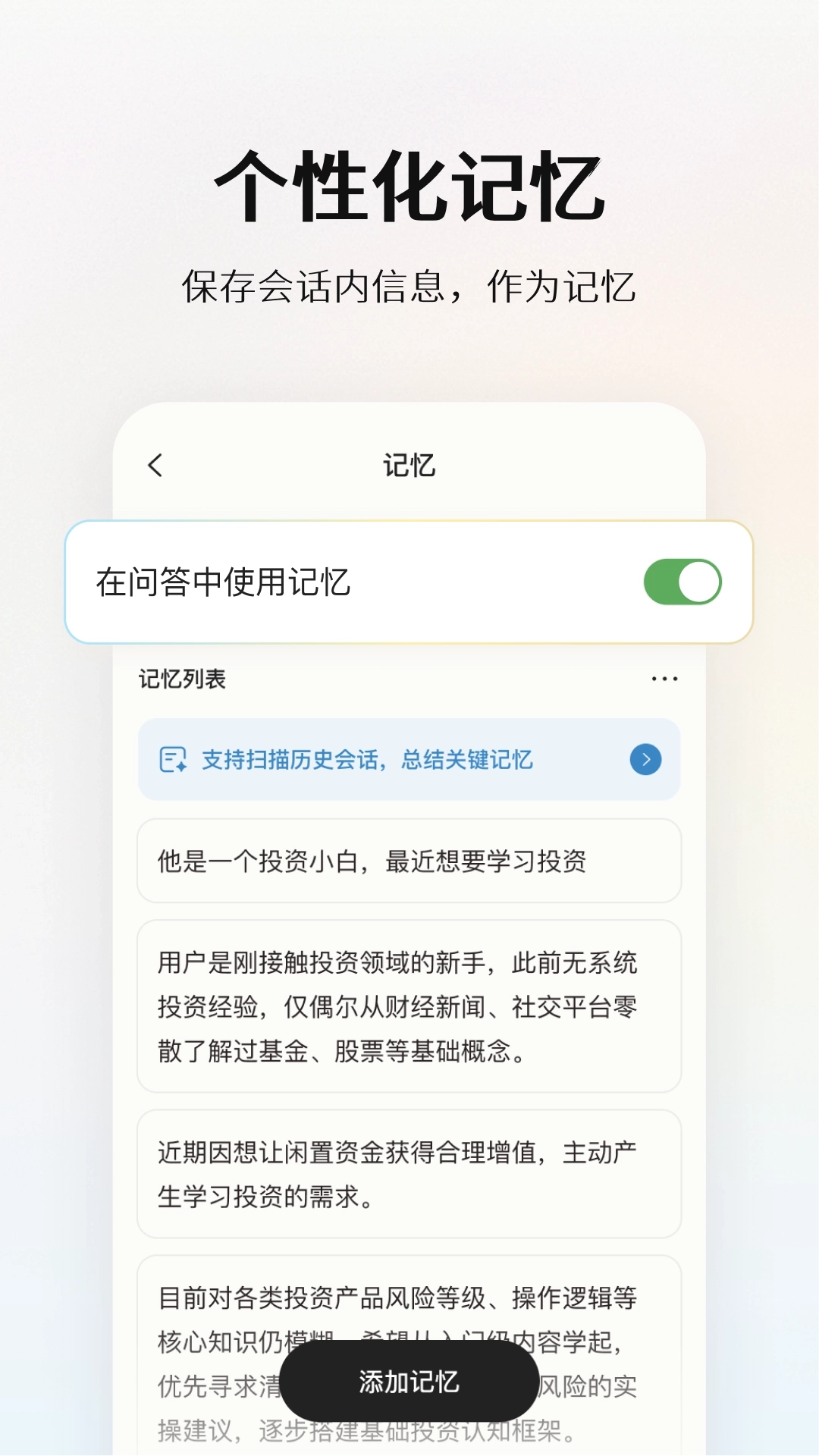 是否生效取决于你是否开启“在问答中使用记忆”功能。开启该功能后,AI在回答问题时会参考你之前保存的记忆内容;若关闭此功能,对话则主要依据当前输入内容来进行回应,这种模式更适合临时对话或不希望关联过往信息的场景。