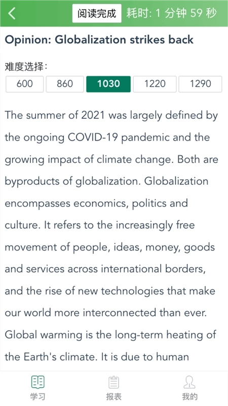 在线即可开启英语阅读练习,还能自主选择英语词汇量进行学习,方便在限定时间内完成任务。