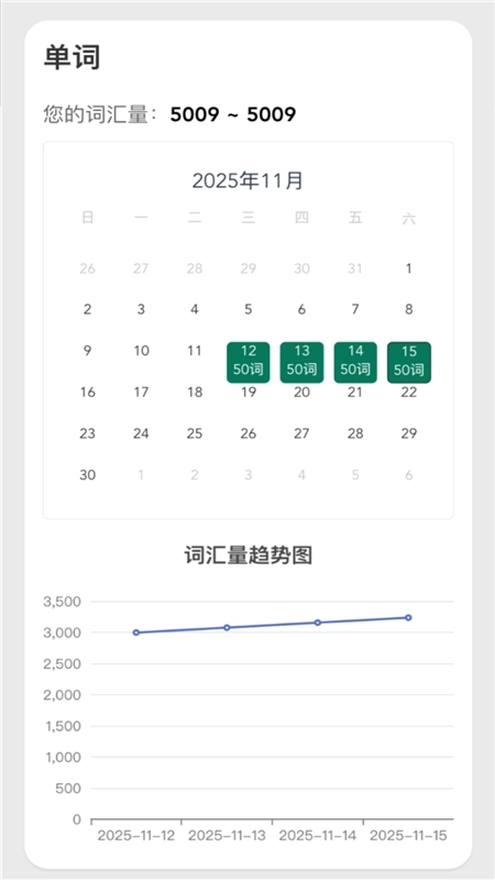 自动记录学习过程中的各项数据,让用户清晰掌握已完成学习的词汇总量,从而更便于他们持续坚持,完成后续的学习任务。