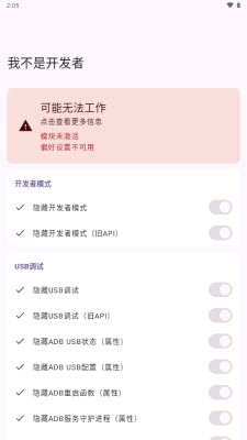 功能开关支持独立控制,可单独开启隐藏开发者选项或应用崩溃防护功能,按需选用更具灵活性。
