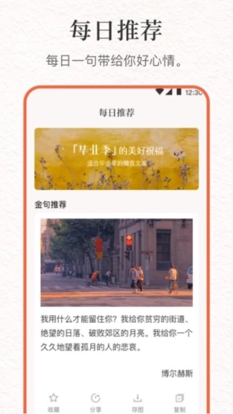 5、收藏功能:便于用户把喜欢的文案或句子收藏好,能够随时进行查看。
