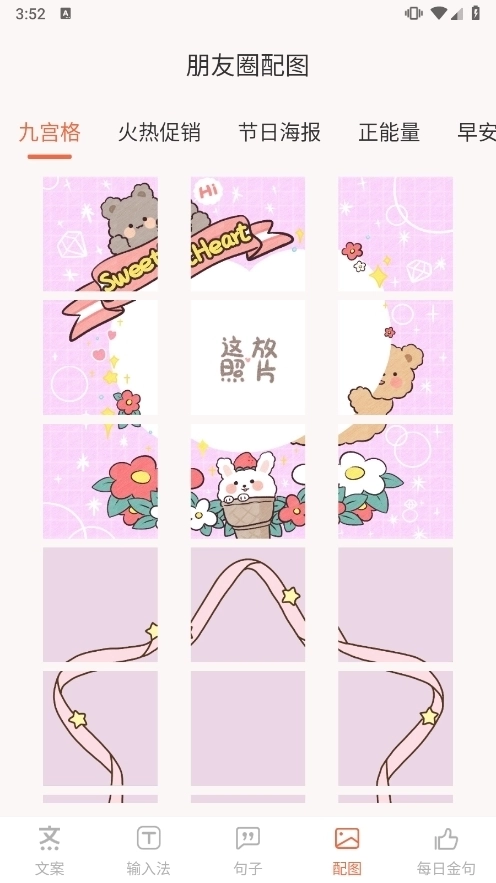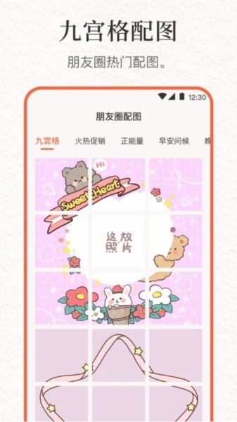 4、朋友圈配图:拥有丰富的图片资源库,其中包含精美的九宫格配图,能够让文案和图片相互衬托、更显和谐。