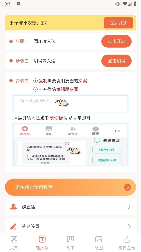 不折叠输入法(部分版本):针对朋友圈文案易被折叠的问题,部分版本的文案句子库额外配备了不折叠输入法功能。借助该输入法发布的文案能够避免被折叠展示,进而提升文案的曝光效果。