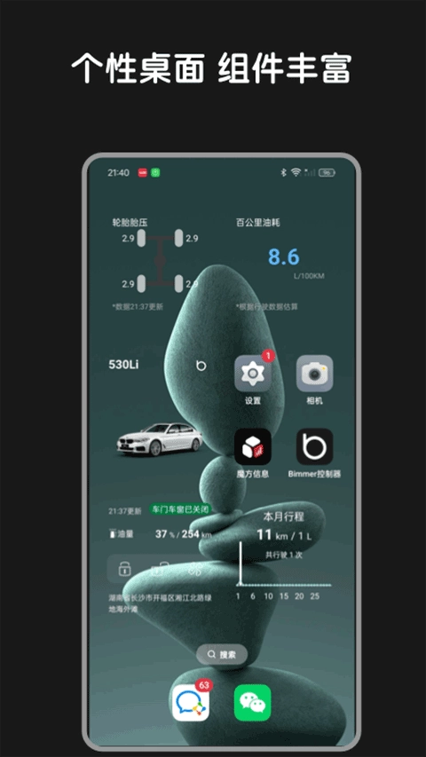 支持多种桌面小组件,小组件样式可自定义;通过小组件能够查看车辆状态、胎压、停留时长、油耗、当前位置的天气与油价,还能对车辆进行通风、解锁、锁车、鸣笛、车灯控制等操作。