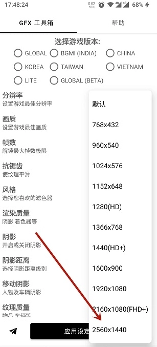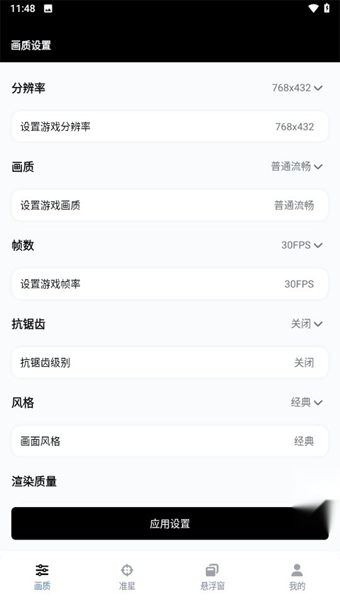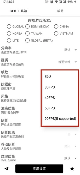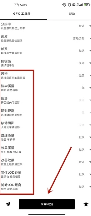 5、另外,在GFX工具箱里还能对阴影、纹理、抗锯齿等多项数据进行调整,所有设置都完成后,点击底部的“应用设定”按钮,就能马上开始体验了!
