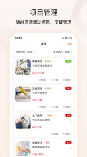 丰富的服务项目:涵盖上门维修、家政保洁、洗衣洗鞋、美容美体等多样化服务,可满足各类商家与顾客的不同需求。