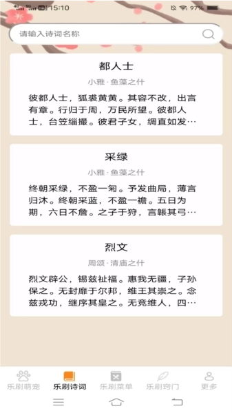 精准诗词搜索功能:可实现精准的诗词查询,助力用户迅速定位到自己感兴趣的诗词内容。