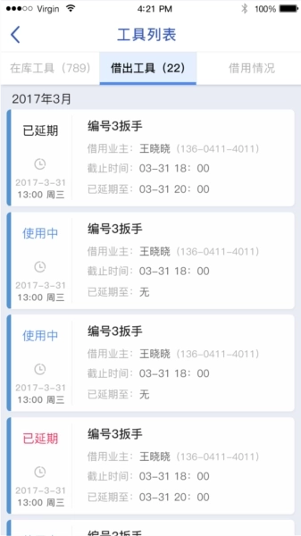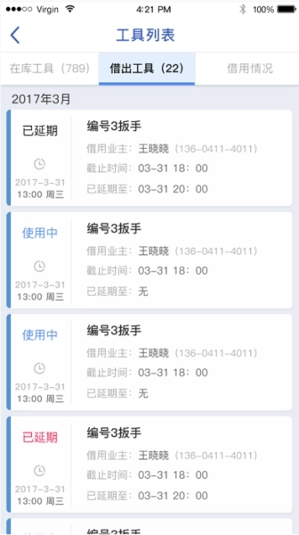 物业员工能够查看工具的借用情况,其中涵盖借用工具的名称、数量以及借用时间等信息。