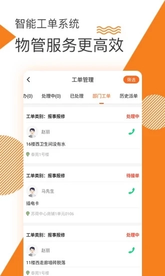 1、设有多种工程工单状态分类栏,涵盖待办、处理中、已处理及历史派单等状态类别;
