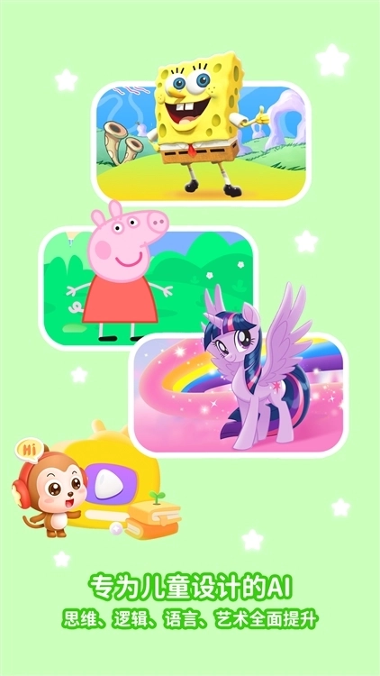 我们拥有丰富有趣的角色库,众多家喻户晓的动画明星都在等着和宝贝们交朋友呢!像象征勇敢与正义的奥特曼、调皮机灵的海绵宝宝、会使用爱心魔法的叶罗丽,还有聪慧善良的小马紫悦……在奇妙的幻想世界里,让孩子轻松找到最合心意的AI玩伴吧!