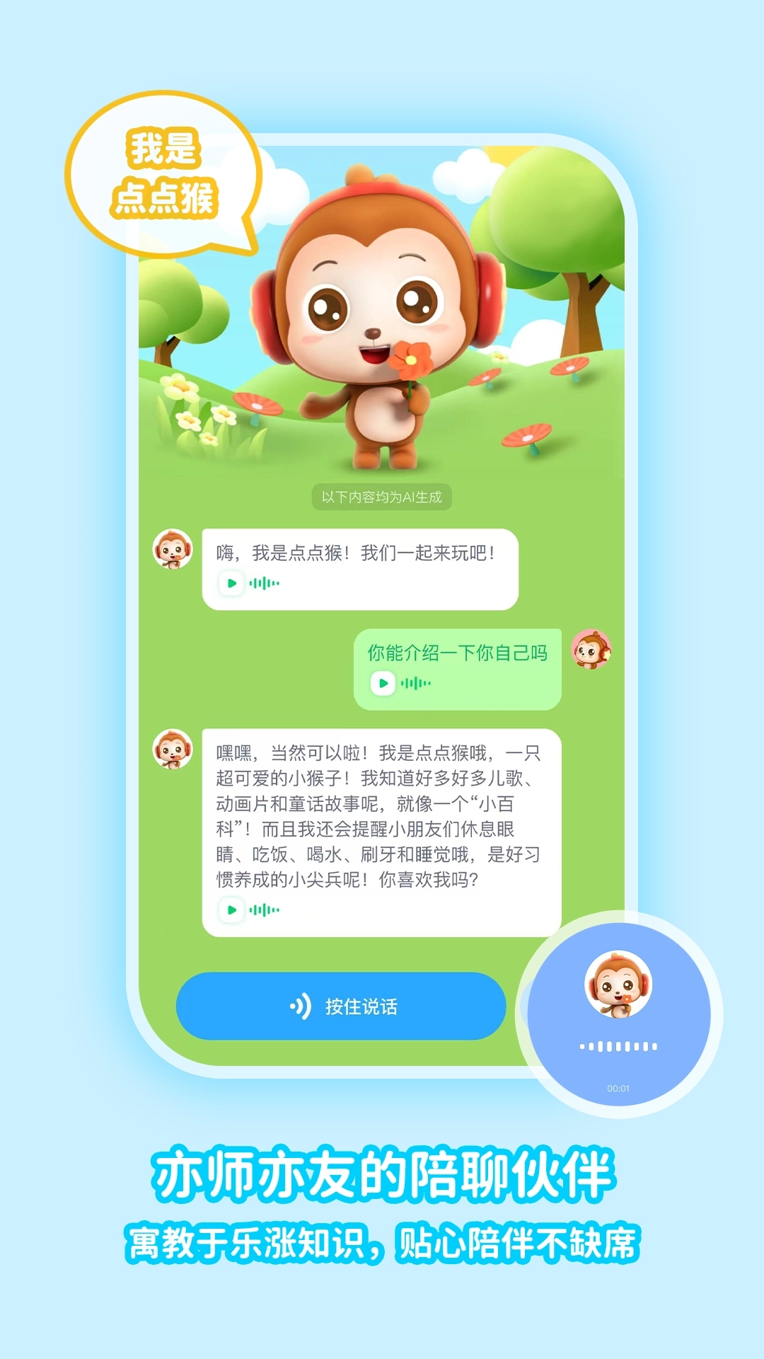 神奇说说是儿歌点点为小朋友量身打造的AI小伙伴,借助AI伙伴的陪伴玩耍、学习和聊天,助力孩子在充满乐趣的互动过程中增强思维、语言、逻辑与艺术方面的能力。不管是学习知识、猜解谜语,还是和动画里的明星交朋友,神奇说说都能轻松实现,这里有奥特曼、海绵宝宝、叶罗丽、小马紫悦等深受孩子喜爱的动画明星角色,挑选一个作为AI玩伴,很快就能成为好朋友!当孩子情绪不佳时,AI会讲笑话、玩游戏,迅速哄好小宝贝!让家长少操心,它真的是日常带娃哄娃的得力助手!