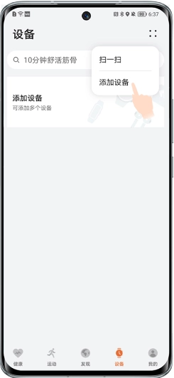 1)打开运动健康App,点击设备>添加设备,运动健康App会自动扫描可连接的设备