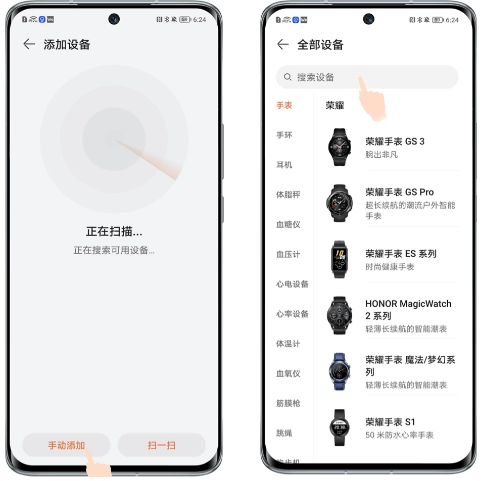 要是自动扫描后,可连接产品列表里没找到您的穿戴设备,您可以点击手动添加,搜索目标设备,再点击开始配对,按照提示完成配对操作。