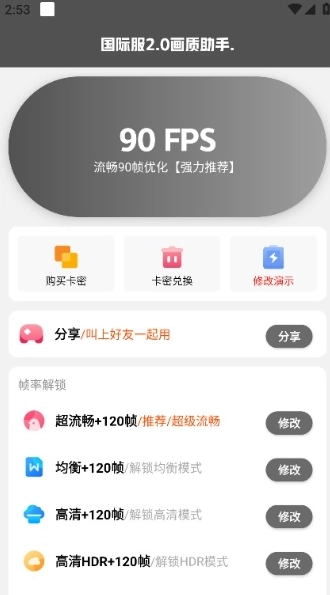 1.提供超流畅、均衡、高清等多种预设画质帧率方案,一键应用即可完成优化