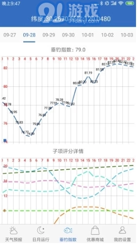 1.垂钓指数分析:软件借助图表呈现垂钓指数,同时提供影响垂钓时段的事件分析,协助用户挑选适宜的钓鱼时机。