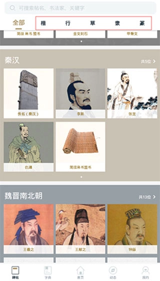 2、打开碑帖,能够看到不同字体以及各个朝代的书法名家。