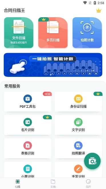 合同扫描王是一款面向现代职场人士打造的多功能智能扫描工具。这款应用支持多种文件格式的一键扫描,还能智能转换文件格式,拥有强大的文件处理能力。它的界面简洁直观,多数核心功能完全免费,能让日常办公更高效便捷。作为全面的移动办公解决方案,它整合了拍照扫描、格式转换、图片编辑和文件管理等功能。无论在办公室还是外出时,只需简单操作几步,就能完成复杂的文件处理任务。该应用具备高清文件扫描功能,OCR文字识别准确率达99.9%,支持中文等多种语言。此外,它还拥有智能拍照翻译功能,支持多国语言即时翻译,大幅提升了跨文化交流的便利性。