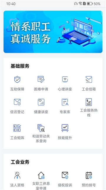 3、进入后,首页设有【入会建会】、【职工转会】、【职工阅读】、【工会热线】、【心理讲座】、【求职招聘】、【技能提升】和【更多服务】等多个功能模块。其中,【更多服务】模块下还包含【基础服务】、【工会动态】、【技能提升】等细分模块。会员点击进入相应模块,按照提示提交所需信息,就能办理相关的工会业务。