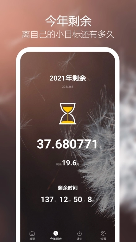 今年剩余:今年还剩多少天?今年还剩多少百分比?倒计时功能会自动帮你计算,让你实时查看剩余天数与百分比,时刻感受到时间的无处不在。