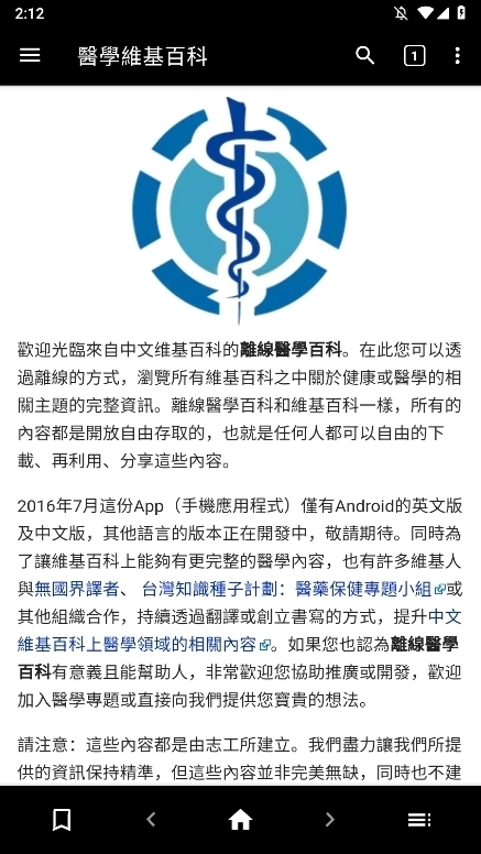 医学维基百科离线版是安卓平台上规模最大的健康照护知识库。无论您此刻处于网络信号薄弱的区域、航行中的船只,还是偏远边境地带,都能免费使用这份最前沿、最新的医疗资料。通过该离线版,您无需联网即可浏览维基百科中所有与健康或医学相关主题的完整信息,且所有内容均支持开放自由获取——任何人都能自由地分享、再利用这些内容。